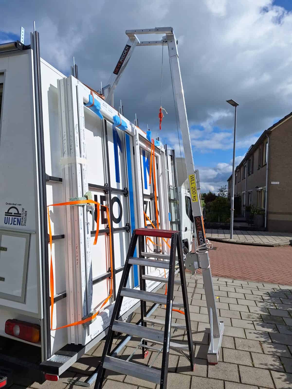 Das Gevelridder Glasresteel Fahrgestellbein ist eine lose Stütze, die am Gevelridder S, Gevelridder Nautica oder Gevelridder M, Gevelridder M Hybrid oder Gevelridder L Hybrid angebracht werden kann, um mehr Platz zu schaffen, um z.B. einen Fensterrahmen höher als das Fahrgestell zu heben. Das Bein soll vom Boden bis zur Mitte des Rohrs 107 cm hoch führen.