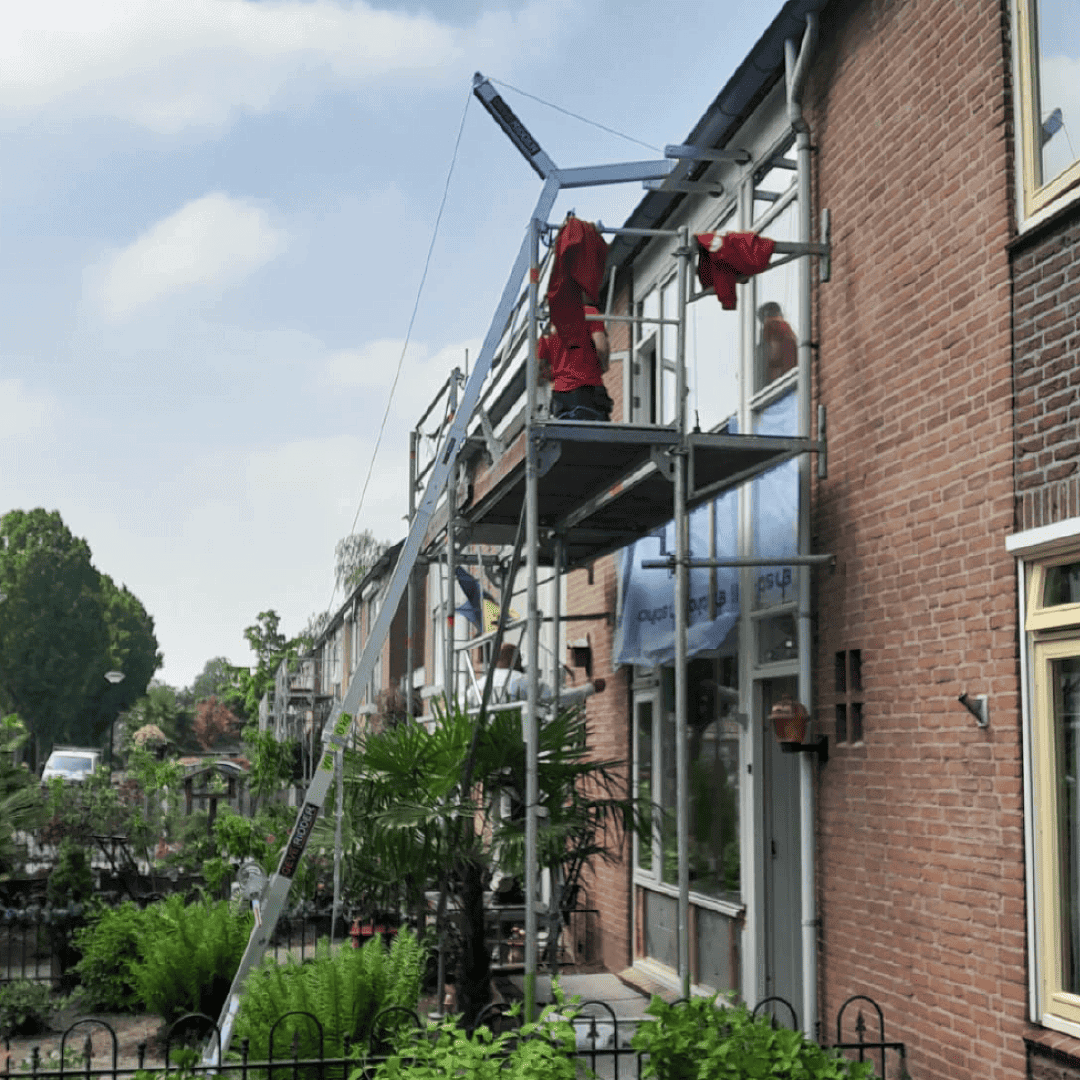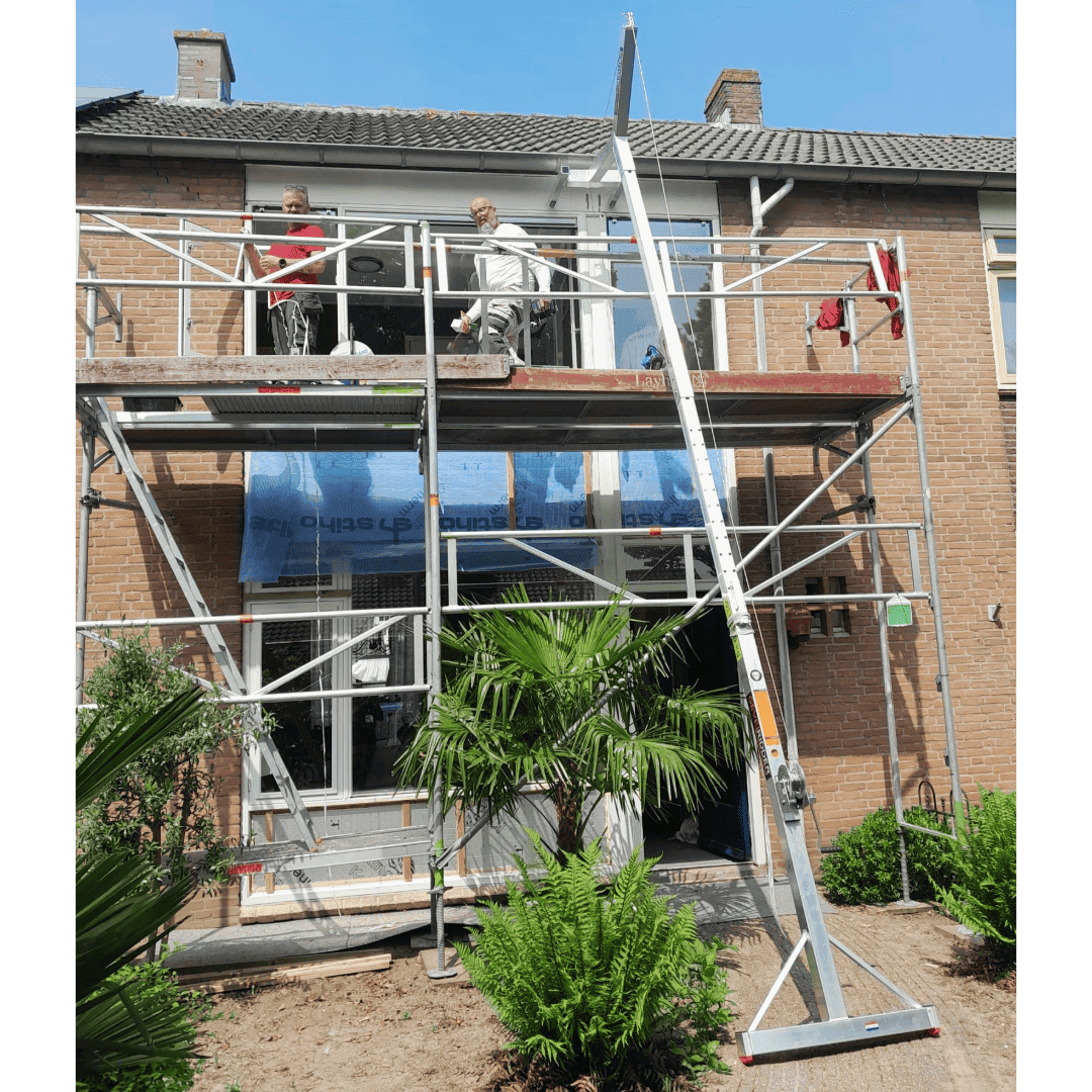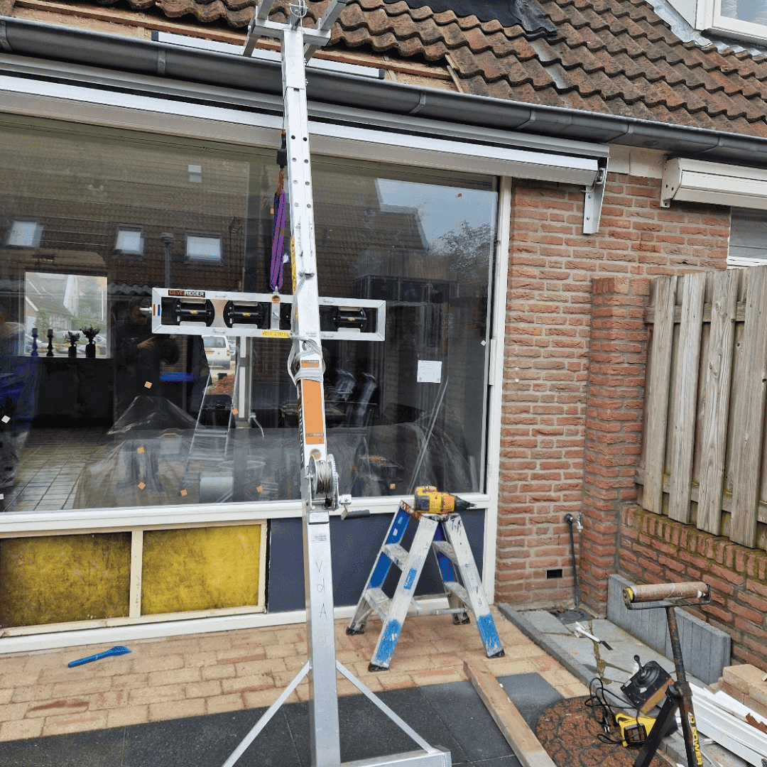 The Gevelridder MG Hybrid, our modern knight of construction, is equipped with an innovative, lightweight winch. Operable with a simple crank or with the power of a cordless drill, this winch offers a revolutionary load-lifting experience. The winch, strategically placed on the outside, creates a generous working space under the Facade Knight (Gevelridder). The Facade Knight (Gevelridder) is ideal for installing heavy windows and window frames, but you can also use it to ideally install or replace blinds, air conditioning units and solar panel inverters. This impressive harness includes: