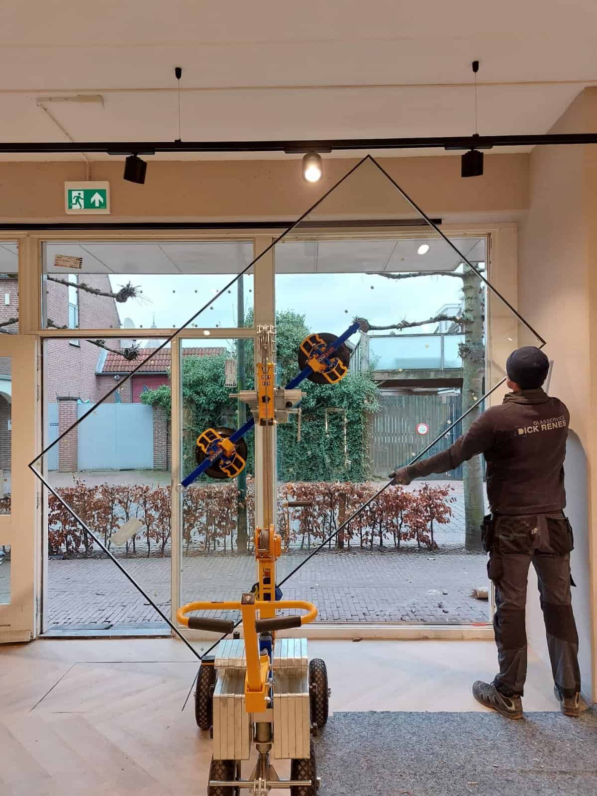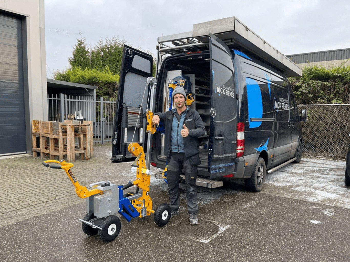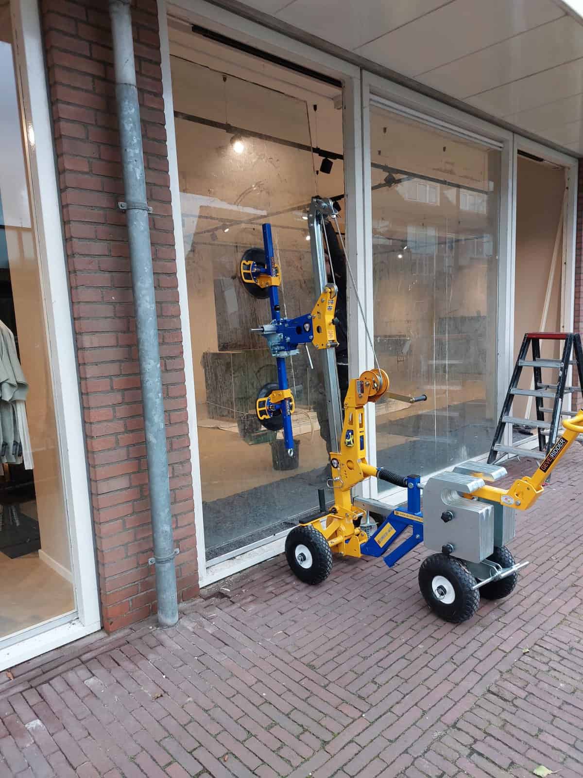 Un lève-vitrage mobile pratique pour tourner, transporter et poser le verre. De plus, tu peux acheter une extension inférieure pour 240 euros supplémentaires pour pouvoir saisir le verre plus bas.