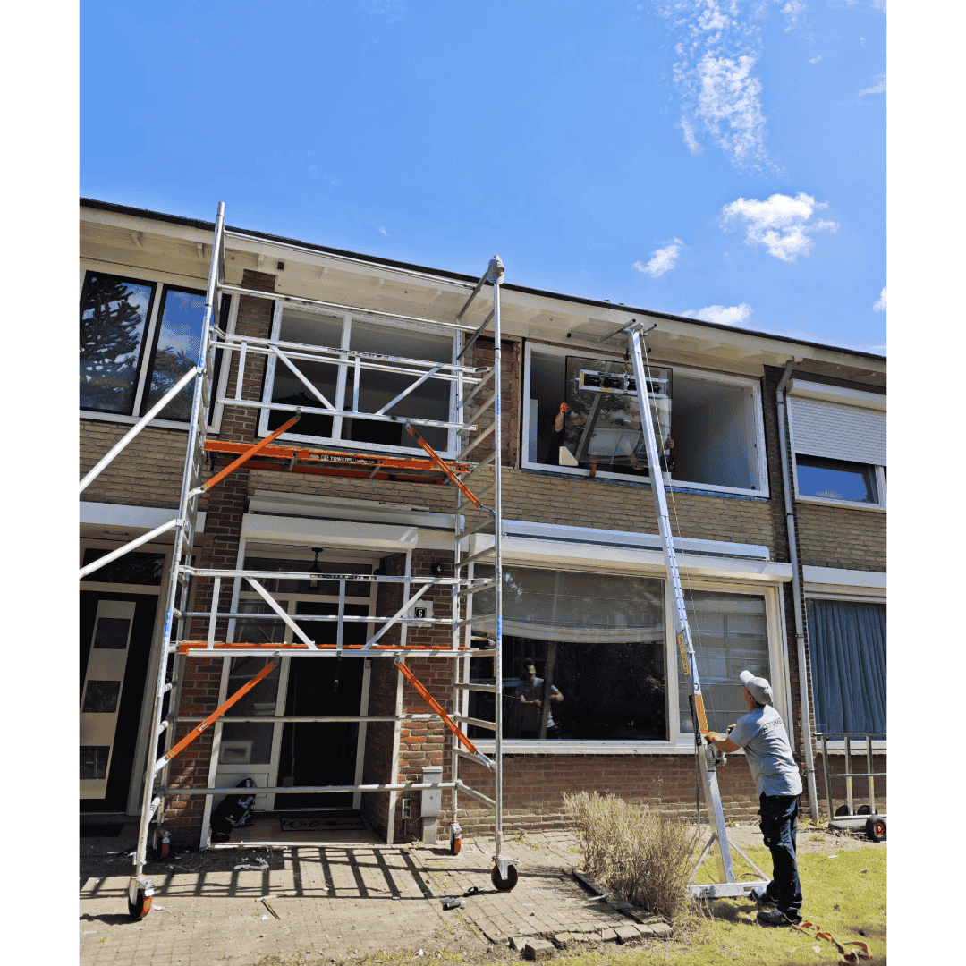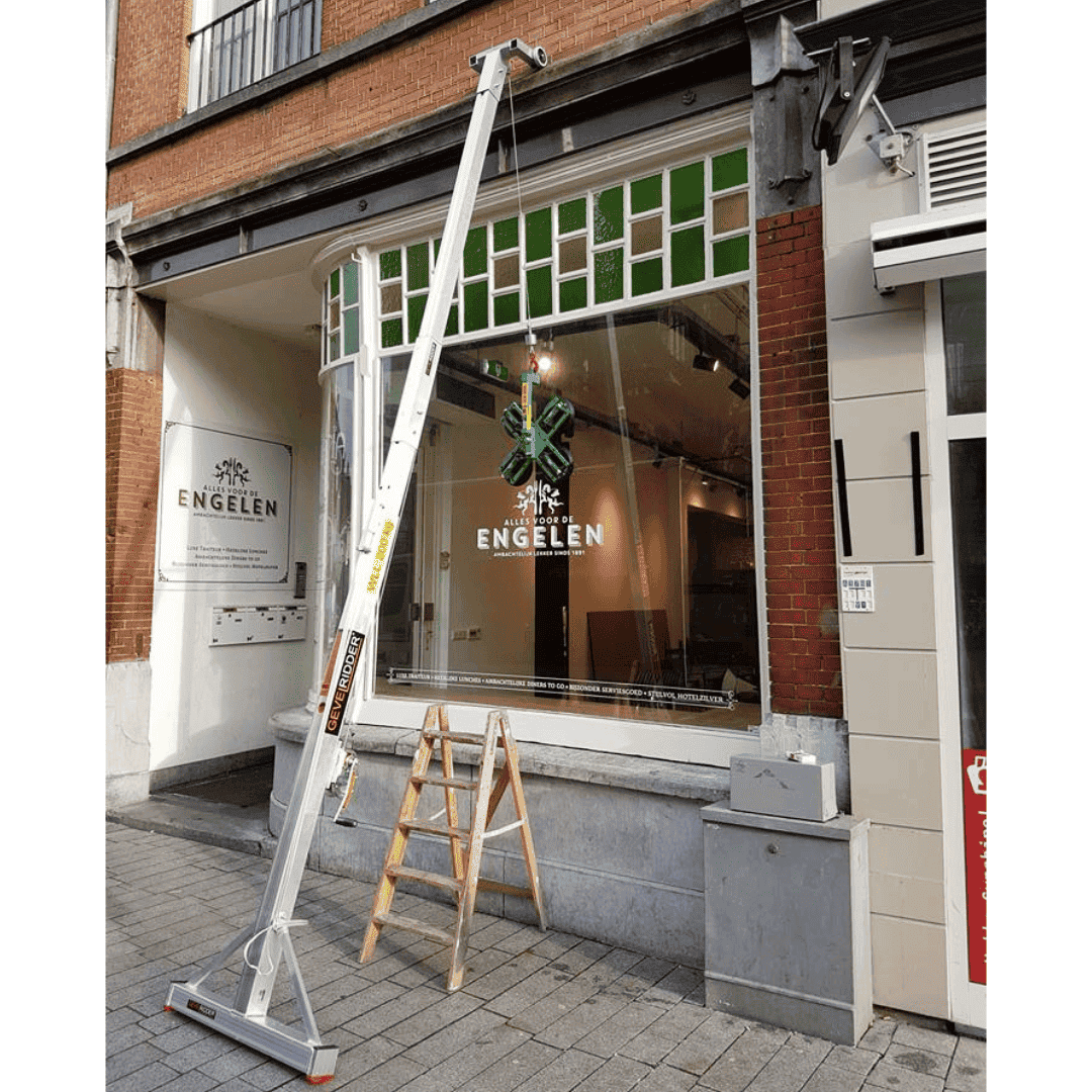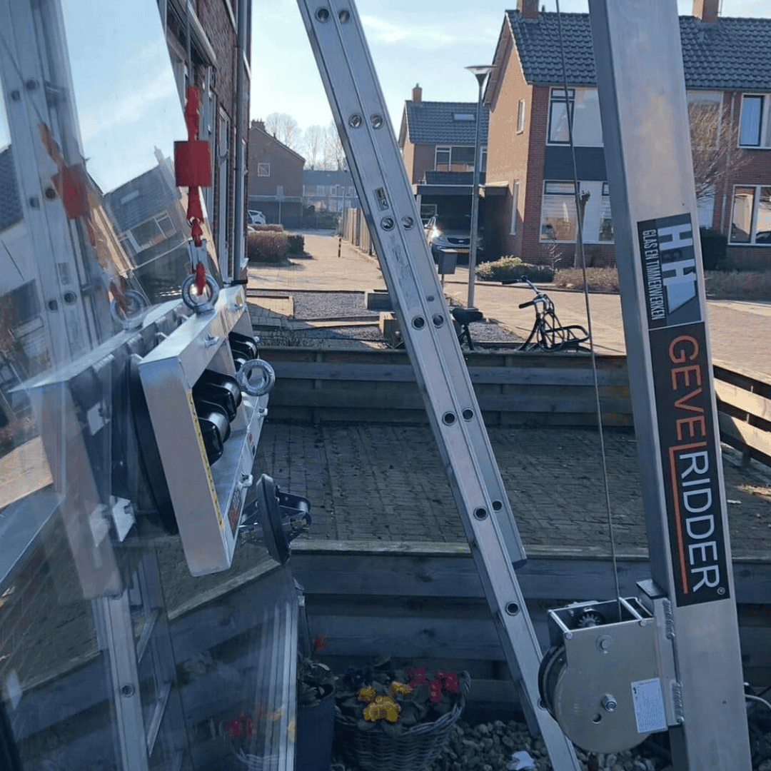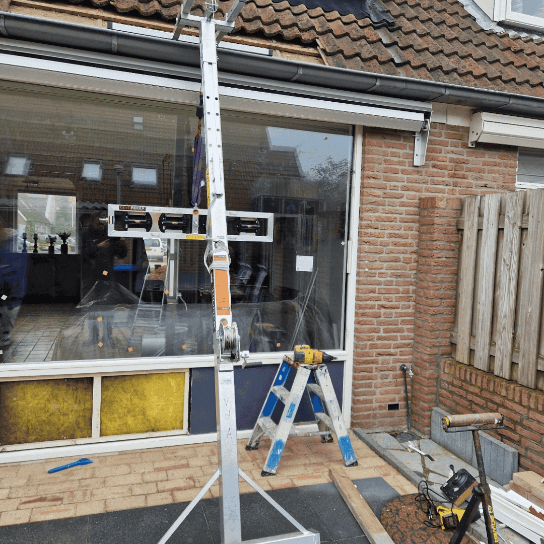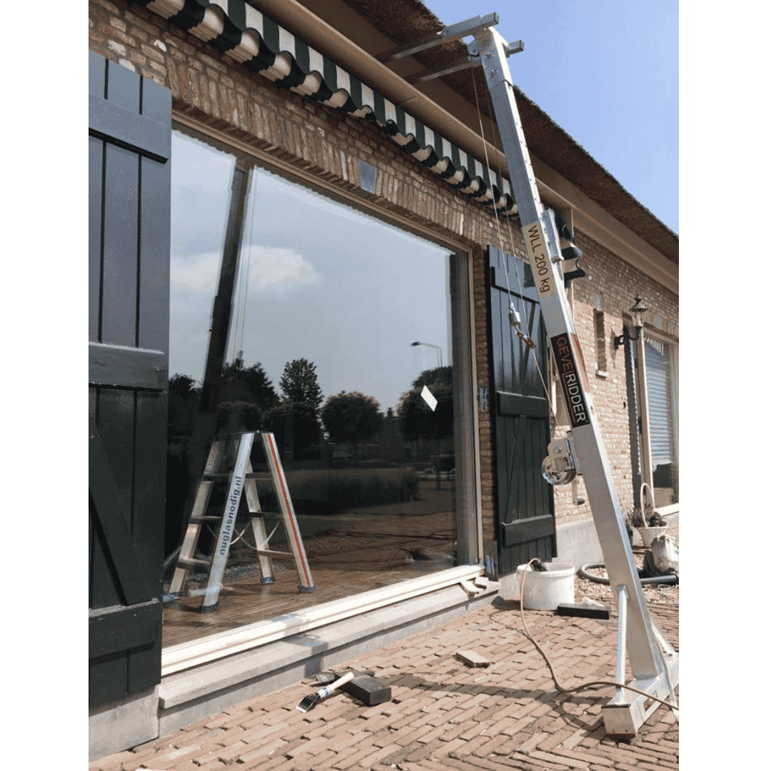 De Gevelridder M is een lichtgewicht minikraan voor glas, kozijnen, warmtepompen en zonwering, speciaal ontwikkeld voor de bouw en afbouw. Je plaatst hem eenvoudig tegen de gevel en monteert zware elementen zonder sjouwen en zonder rugpijn. Dit compacte tilhulpmiddel neemt weinig ruimte in in de bus: ingeschoven is de Gevelridder M slechts ca. 2,4 meter lang en daardoor makkelijk mee te nemen naar iedere bouwplaats. Op de klus schuif je de Gevelridder met de bijgeleverde verlengkoker uit tot een maximale hijshoogte van ongeveer 5,8 meter. Zo kun je ook op de eerste verdieping glas plaatsen, kozijnen stellen of een buitendeel van een warmtepomp monteren, zonder mobiele kraan. Met de extra uitzetbeugel/afstandhouder gebruik je de Gevelridder M bovendien om glas veilig van een glasbok of resteel te hijsen naar de Gevelridder glaskar. Daarmee wordt zwaar tilwerk vervangen door mechanisch hijsen, verminder je de fysieke belasting voor je monteurs en werk je Arbo-proof met een professioneel tilhulpmiddel waar glaszetters, aannemers en installateurs in de praktijk echt wat aan hebben.