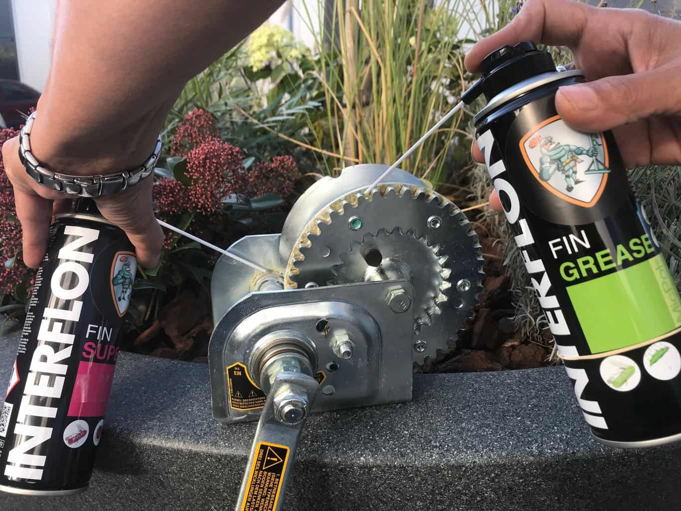 Onderdelen reinigen met een oplosmiddel of alkalische reiniger. Interflon Fin Super (aerosol) aanbrengen op onderdelen als kabels en kettingen en laat deze inwerken. Verwijder overtollig smeermiddel met een schone doek. N.B. gebruik niet te veel Interflon Fin Super (aerosol). Nasmeren met een dunne laag werkt beter dan één dikke laag.