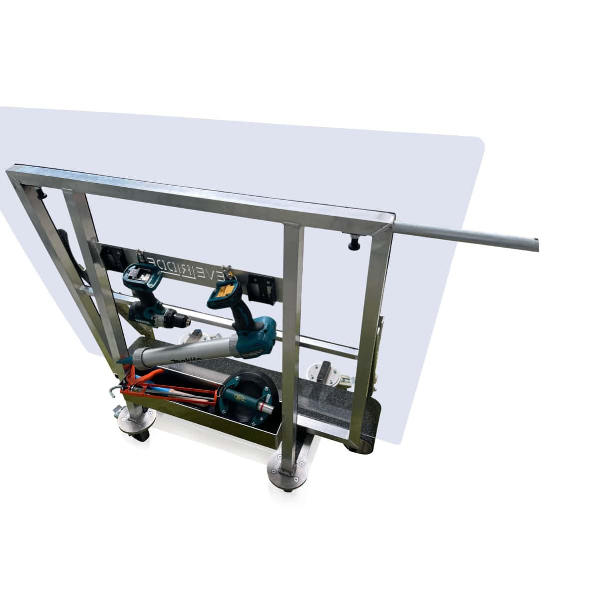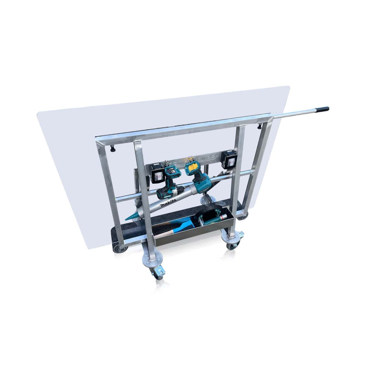 Veelzijdigheid en gebruiksgemak: Dankzij het innovatieve ontwerp van de Gevelridder glaskar, ben je verzekerd van gemak, zelfs in de krapste ruimtes. Met een gewicht van slechts ongeveer 14 kg is deze platenwagen buitengewoon licht en draagbaar. Of je nu tafelbladen, aanrechtbladen of waardevolle kunstwerken vervoert, met Gevelridder ben je verzekerd van veilig transport.